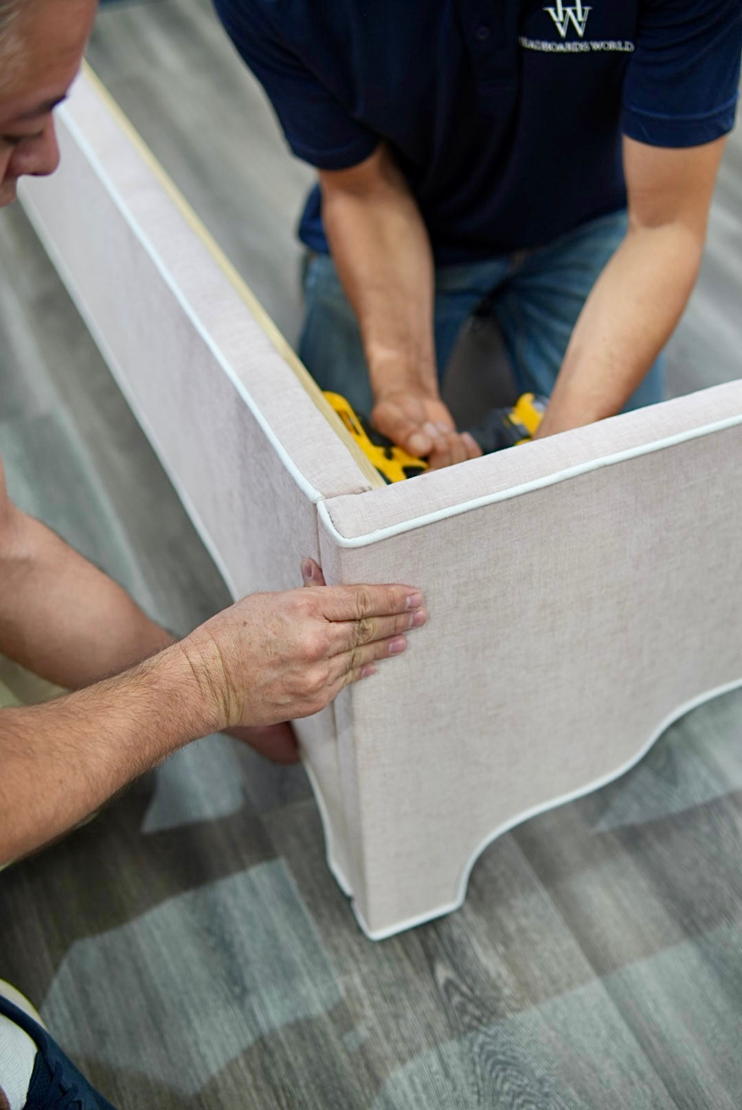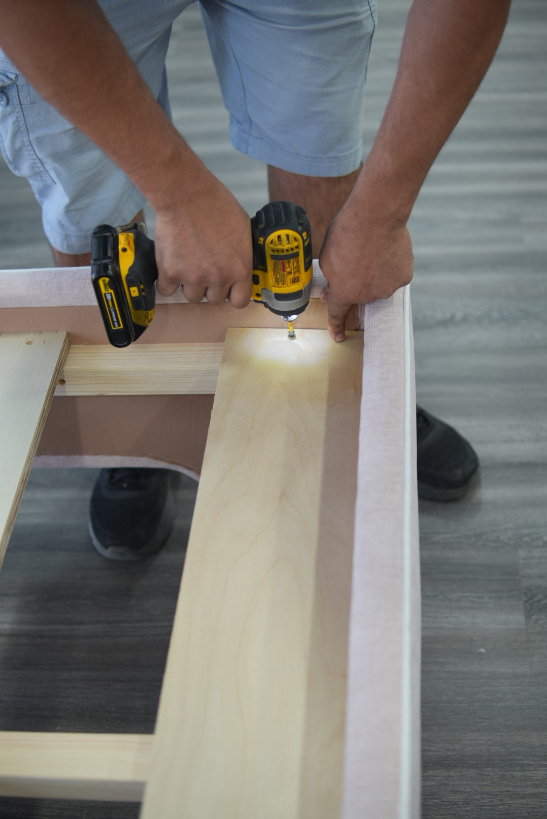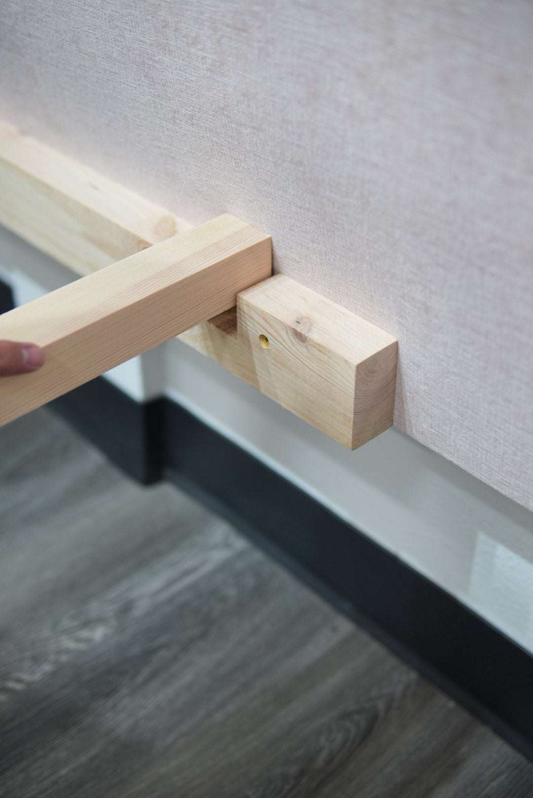 2. Align one first  sideboard with the front of the headboard leg, making sure it’s flush on the outside.