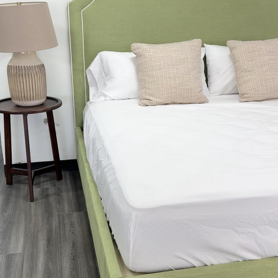 65" H King Upholstered Platform Bed - Brown Wooden Legs - Pistachio Green Woven Fabric with White Trim