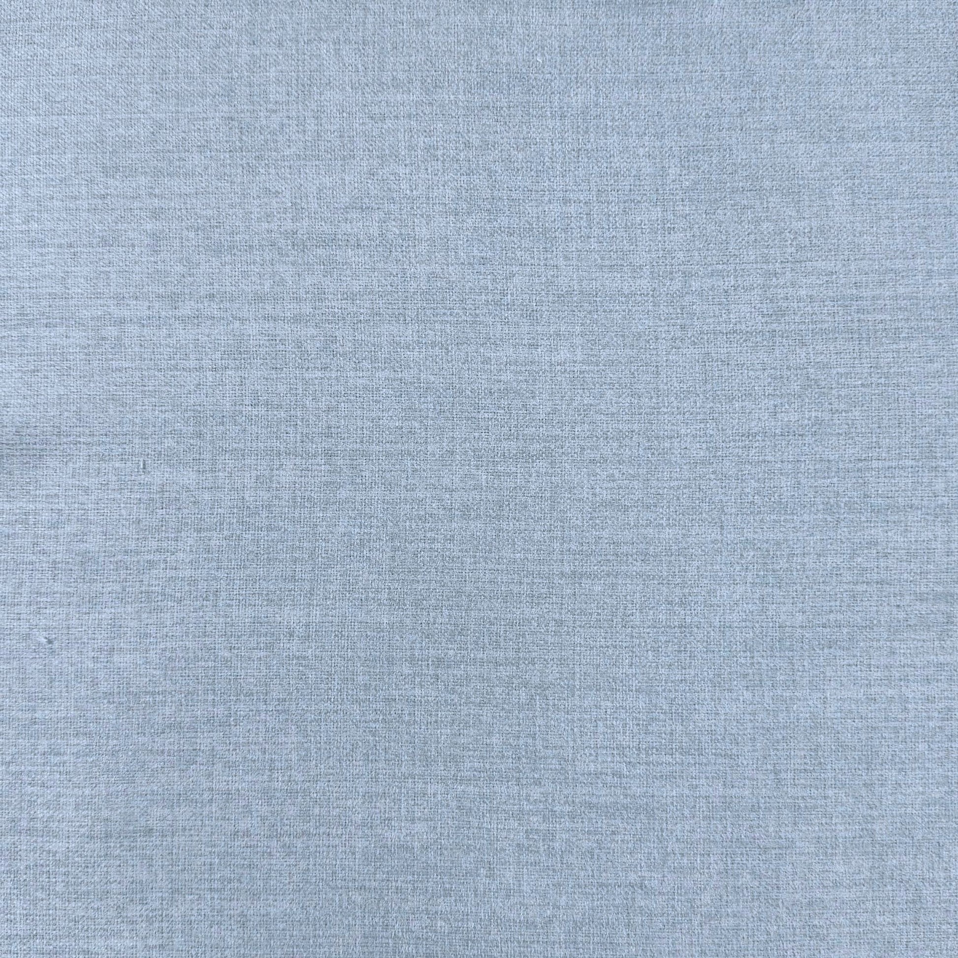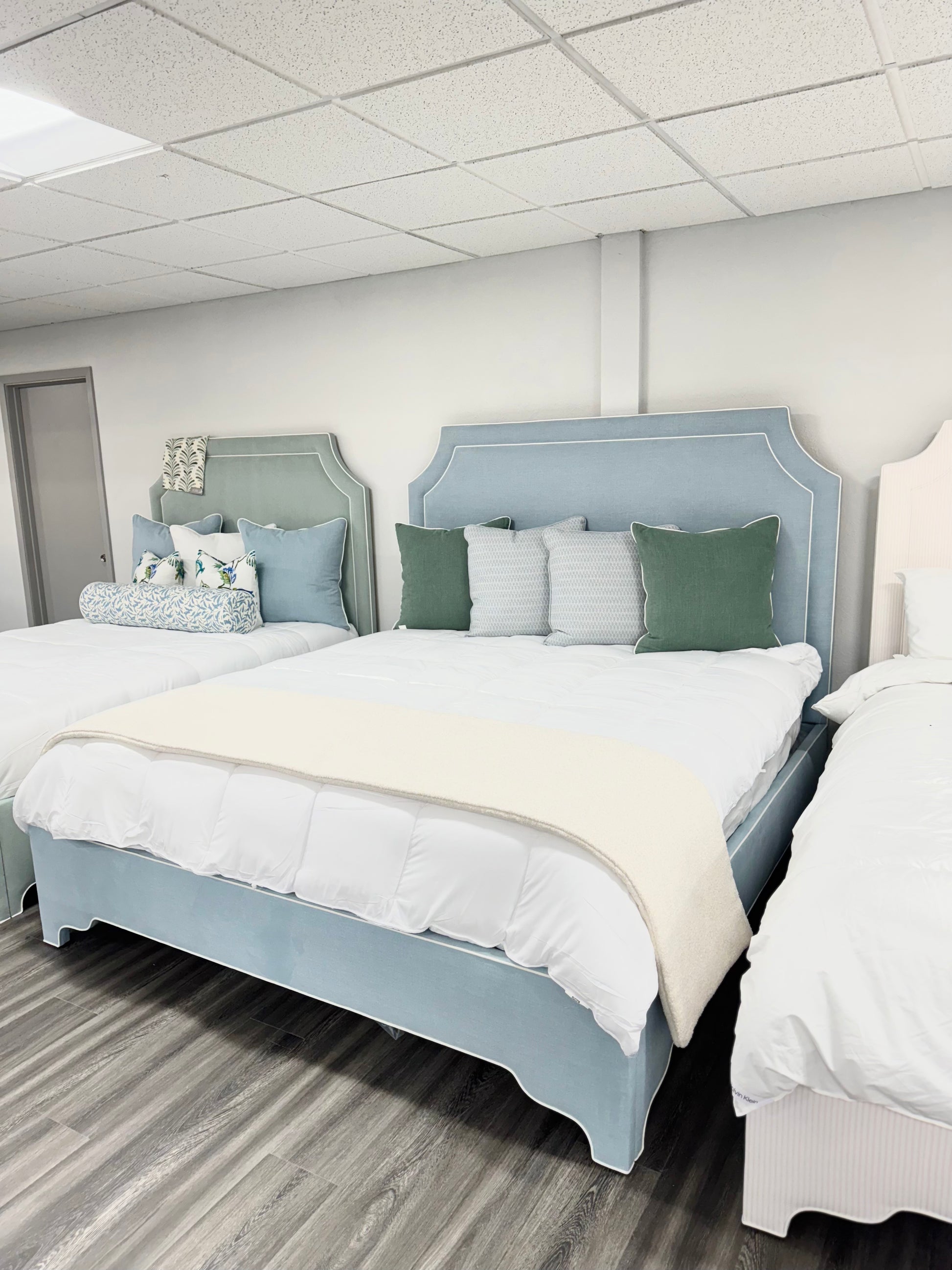 65" H King Platform Bed - Scalloped Legs - Sky Blue Woven Fabric with White Trim