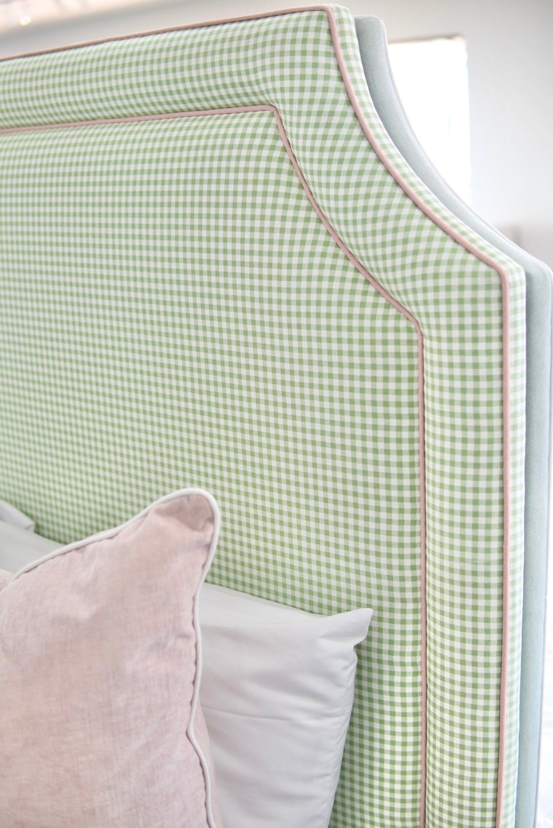 65”H Queen Platform Upholstered Bed - Sage Green Gingham Fabric with Blush Pink Trim