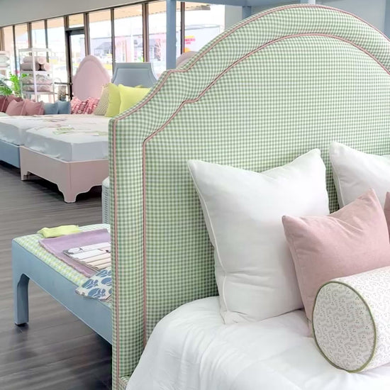 65”H Queen Platform Upholstered Bed - Sage Green Gingham Fabric with Blush Pink Trim