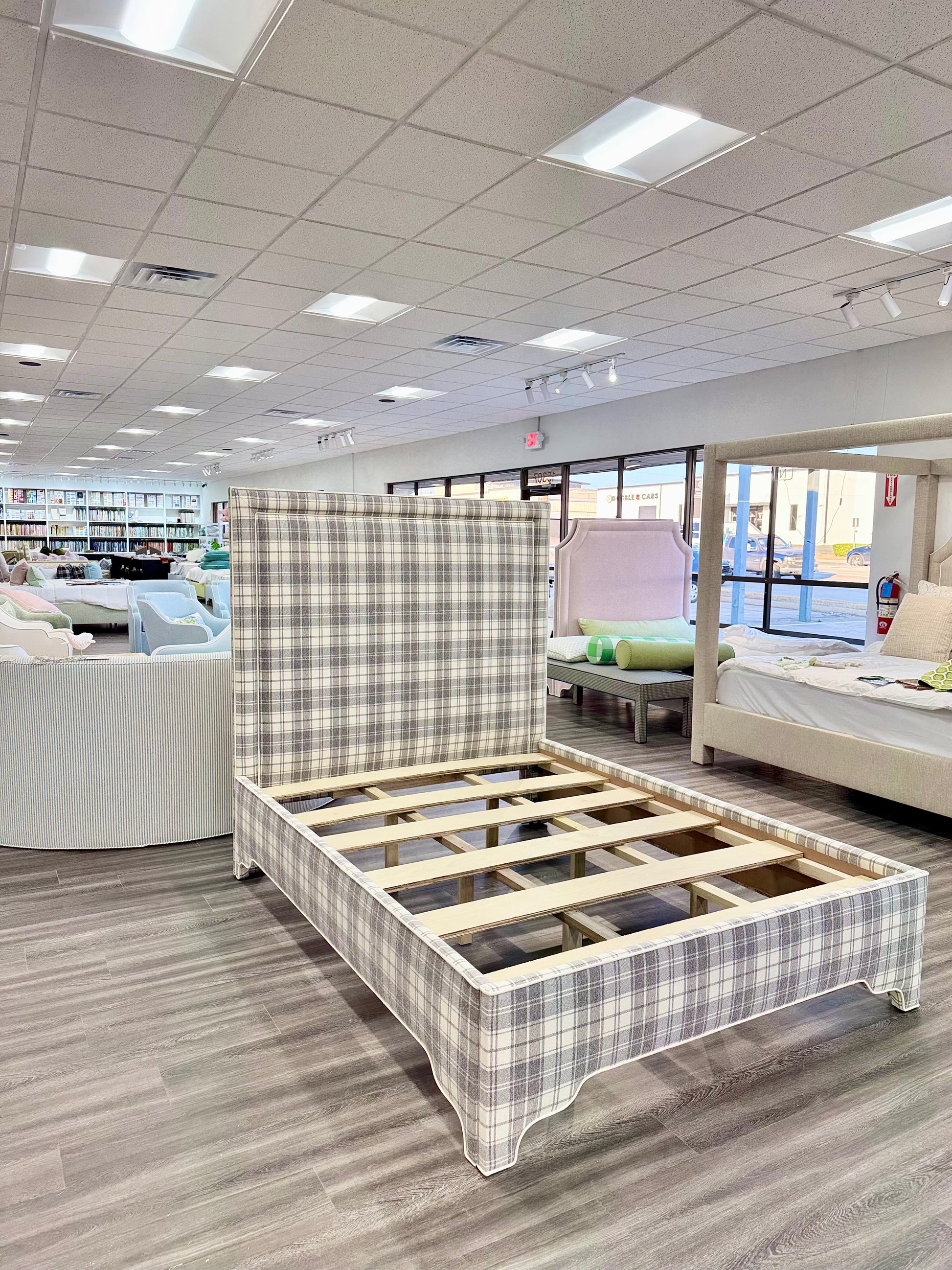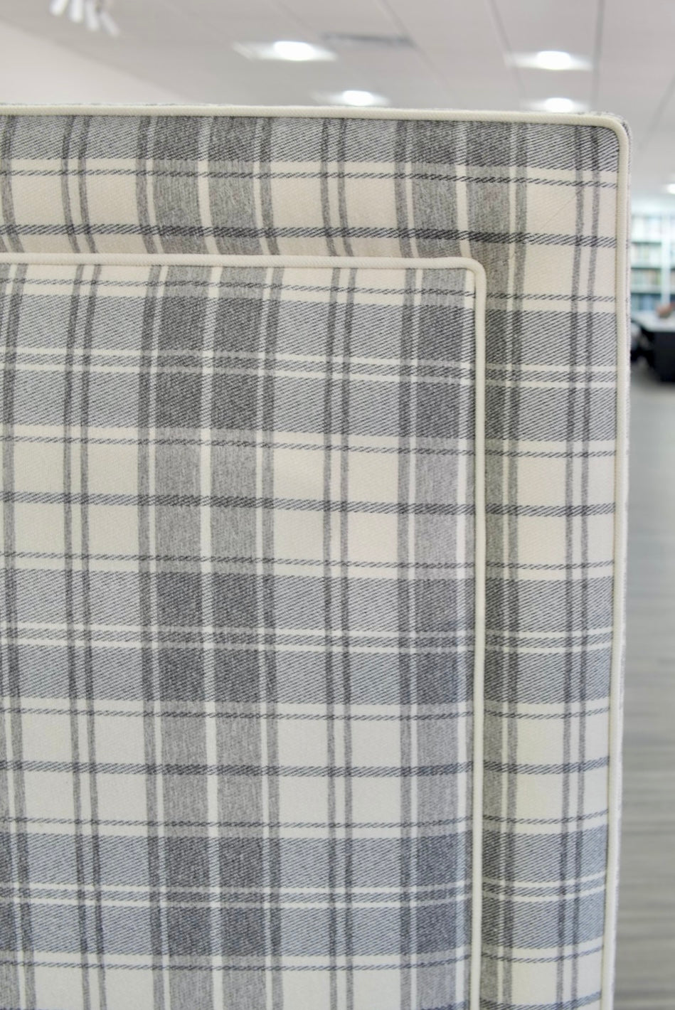 • Fabric: Grey Plaid Fabric - White Trim