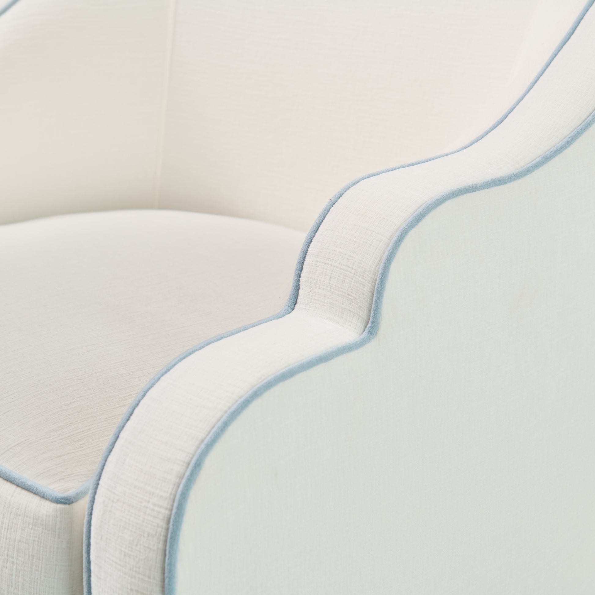 Custom Scalloped Swivel Chair: White Performance Fabric - Sky Blue Trim