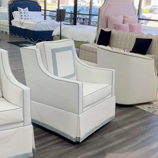 Custom Swivel Glider Chair – White Linen with Sky Blue Trim