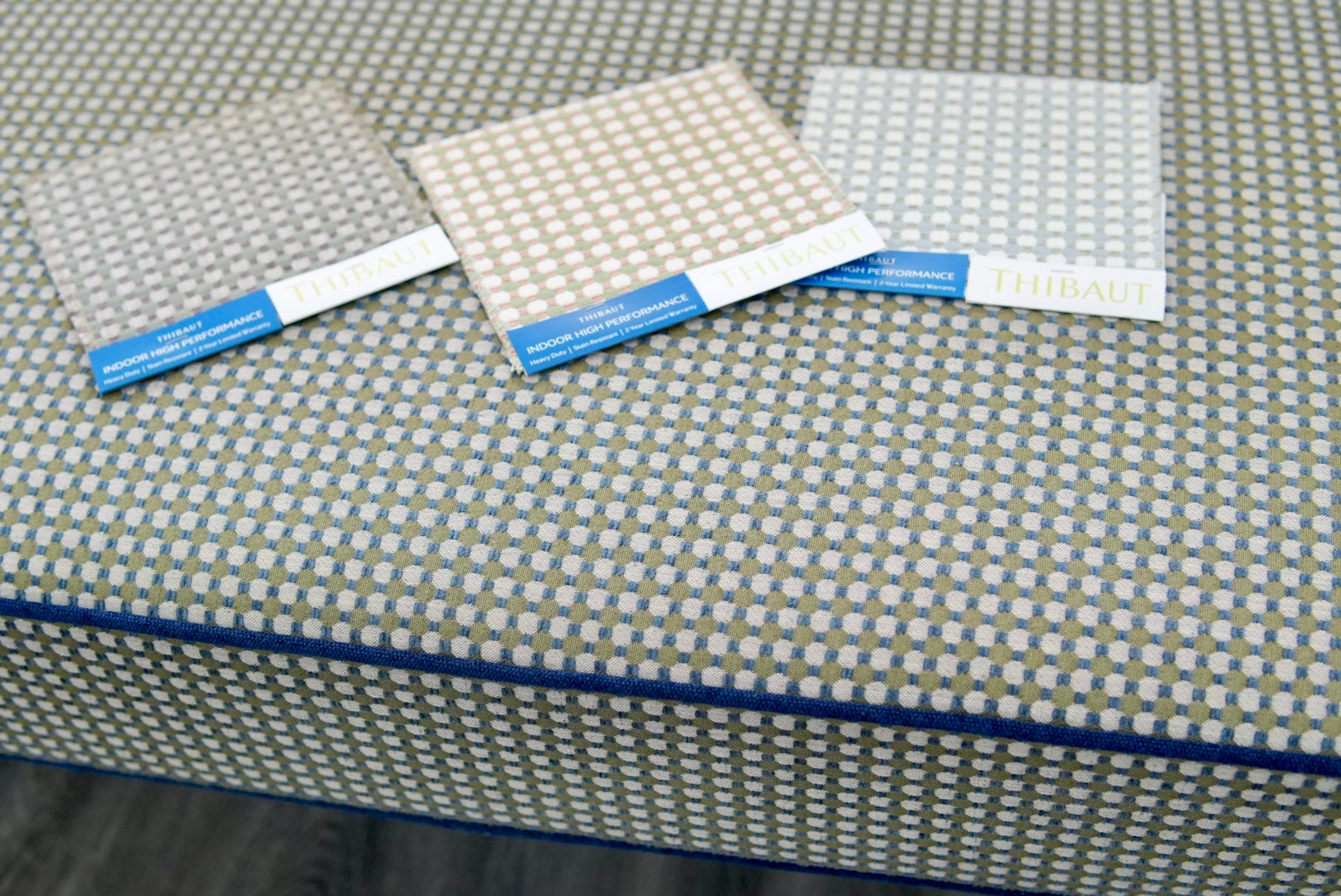 Custom Upholstered Bench in Thibaut Fabric - Navy Trim