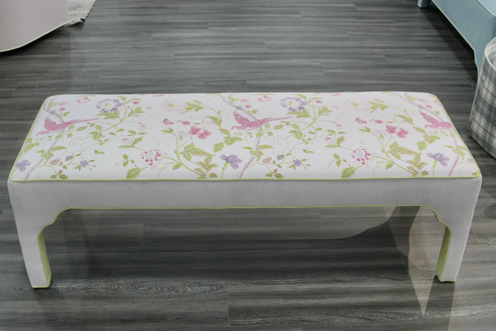 Custom Upholstered Bench in Floral Fabric - Pear Green Trim