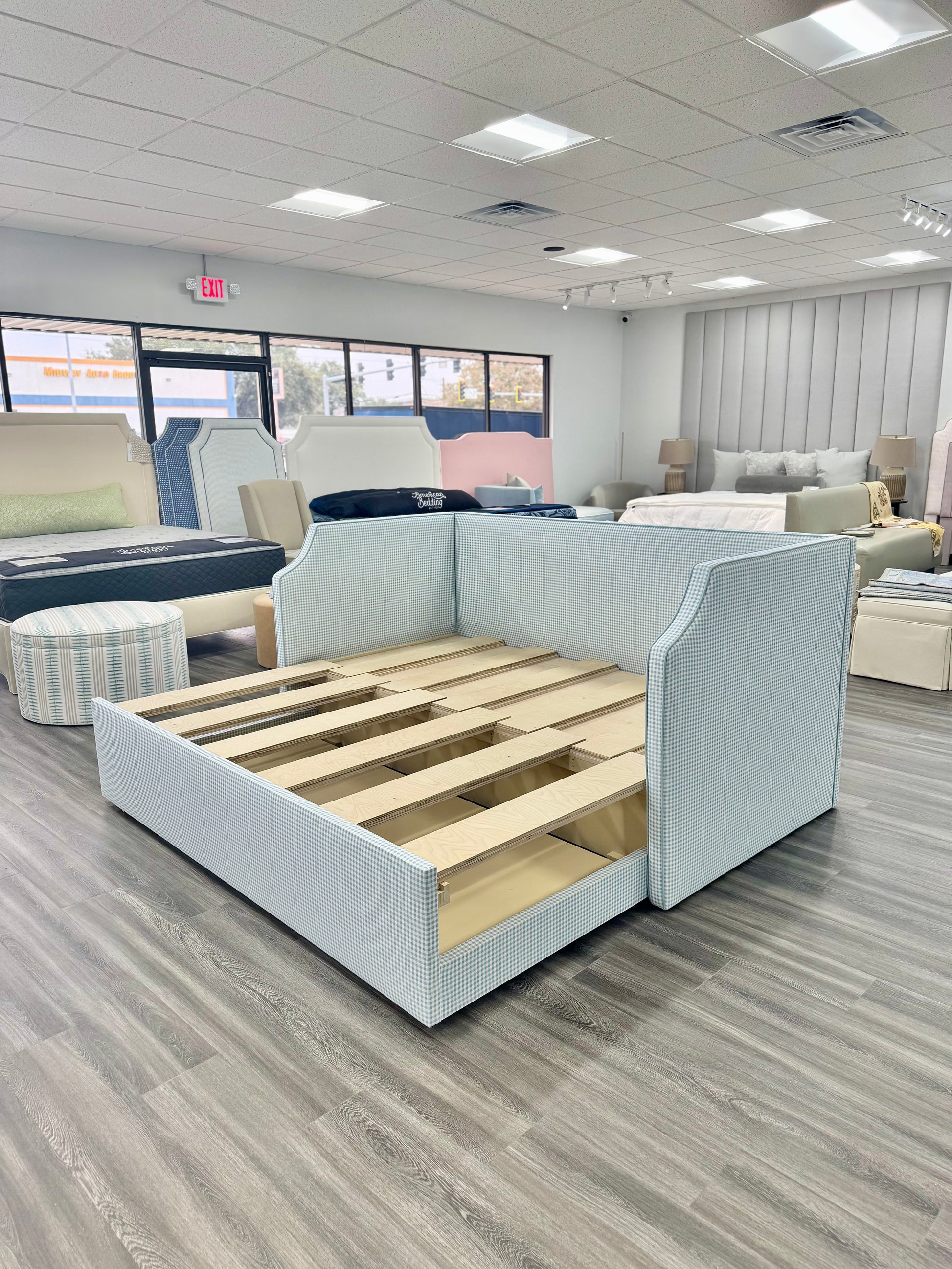 Twin to king Upholstered Trundle Daybed in Blue Gingham fabric - Sky Blue Trim